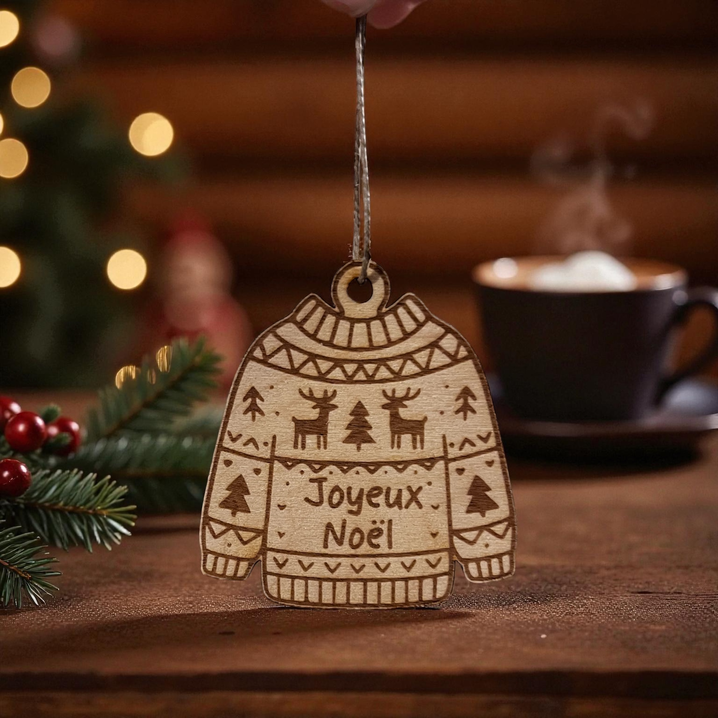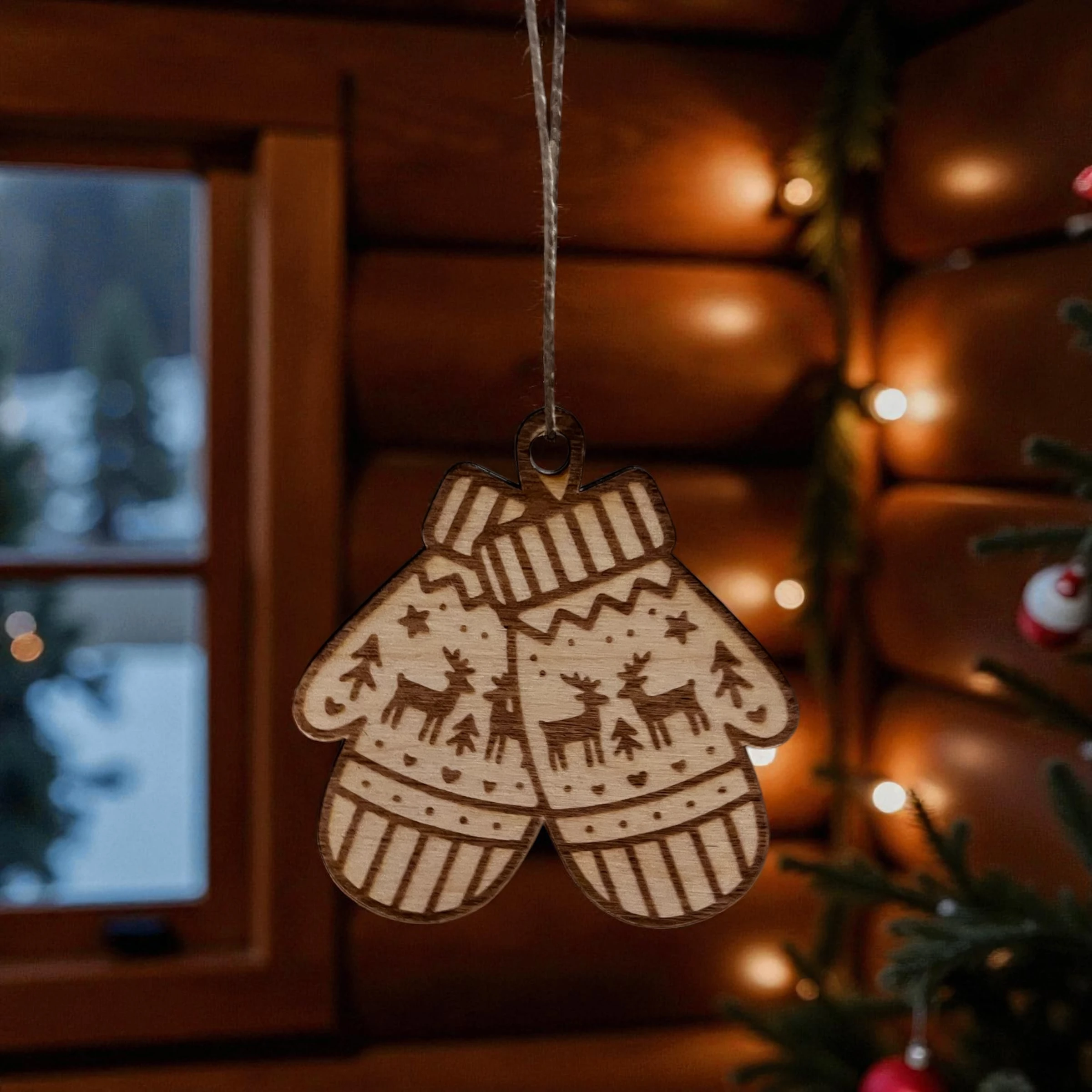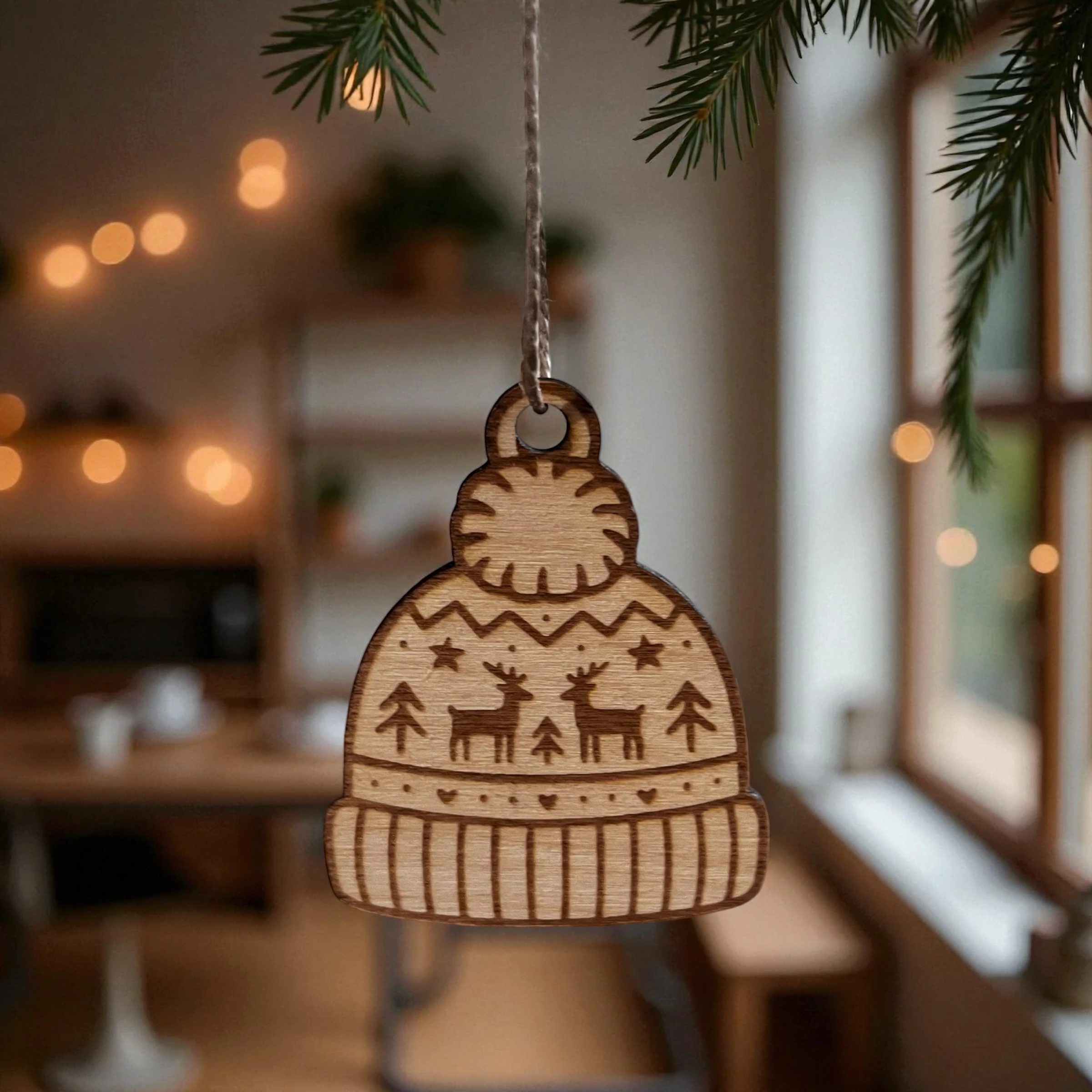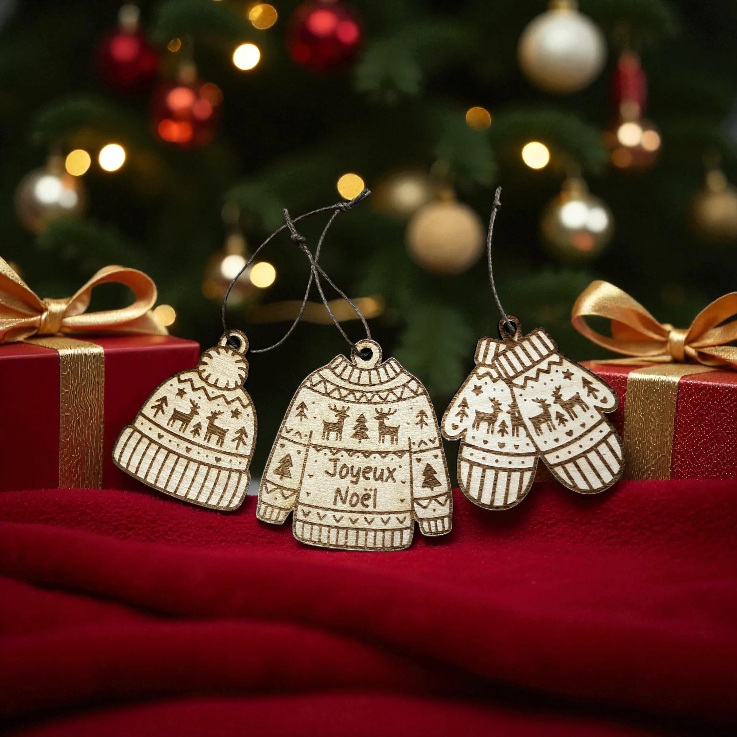 Chaque pièce représente un symbole d’hiver – bonnet, pull ou gants – soigneusement découpé et gravé au laser pour un rendu précis et élégant.