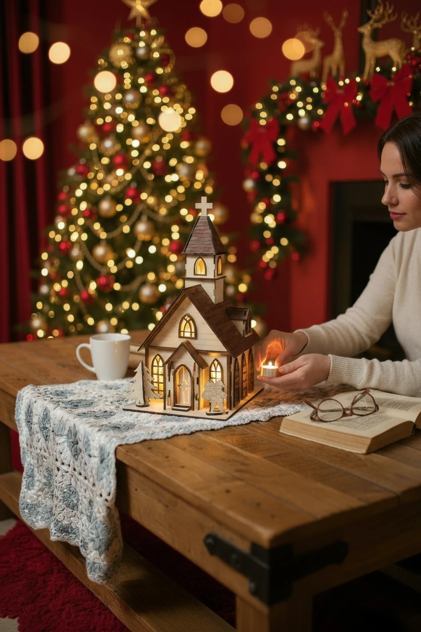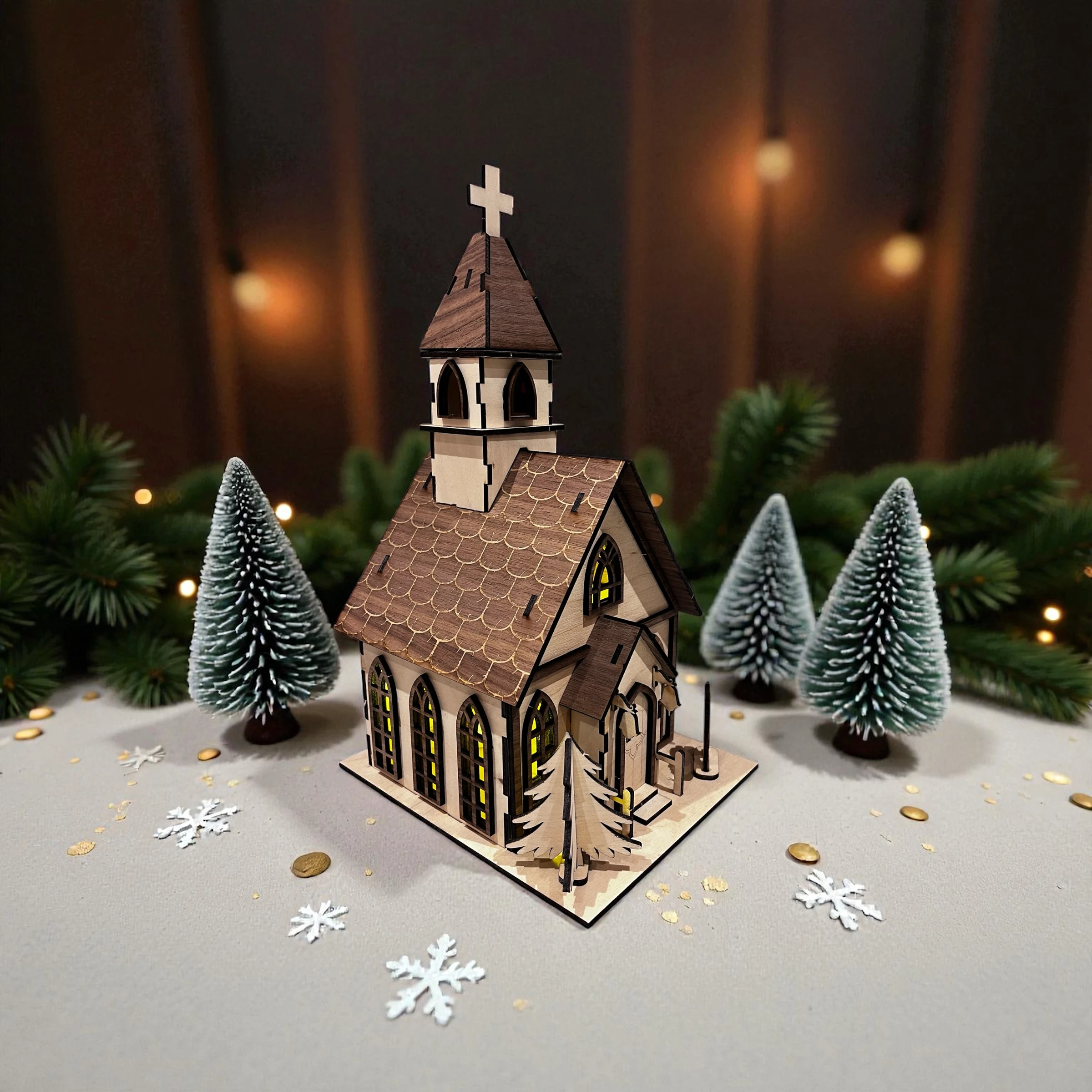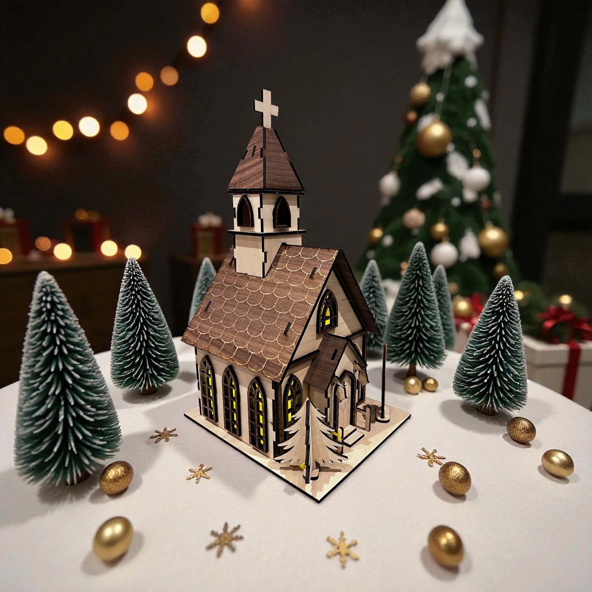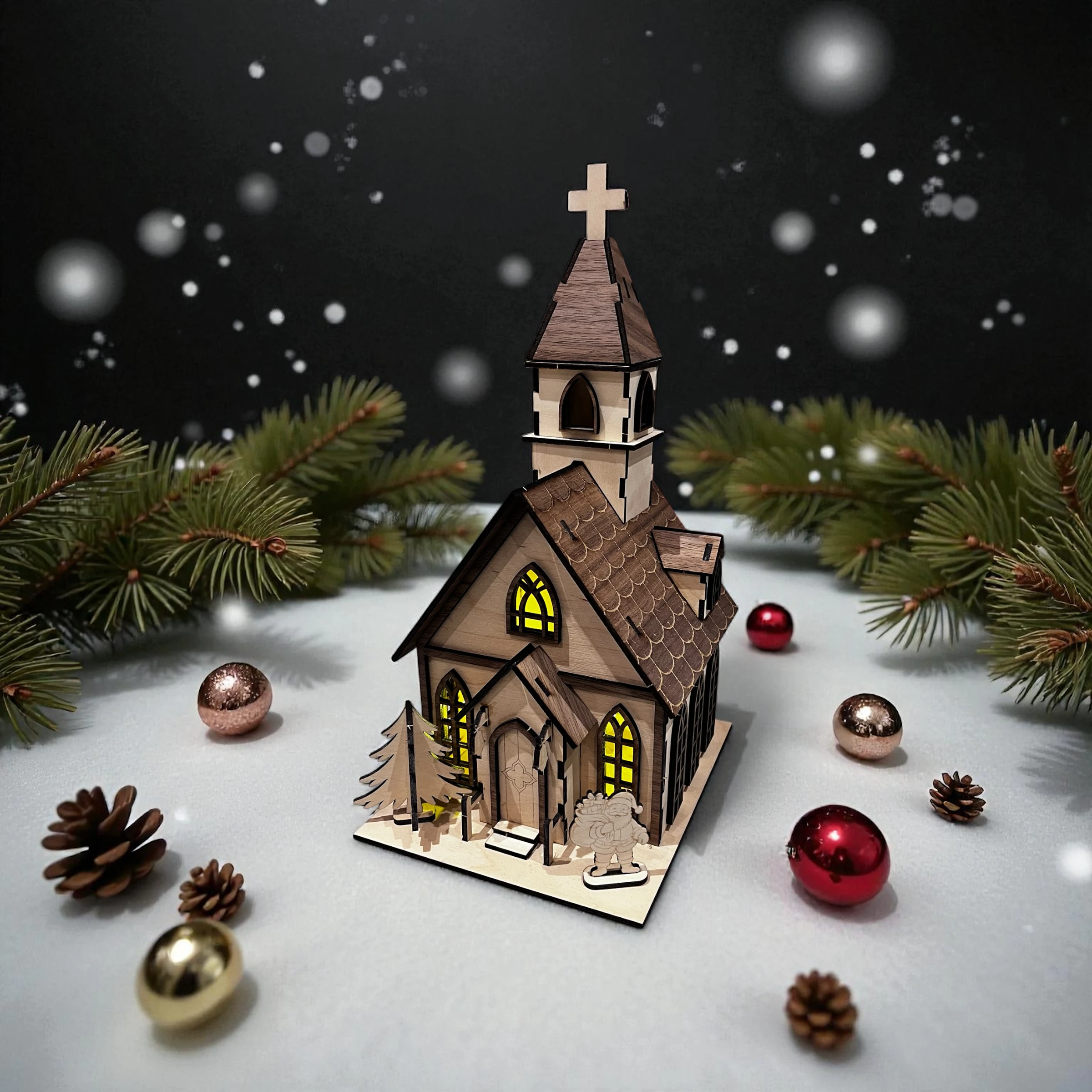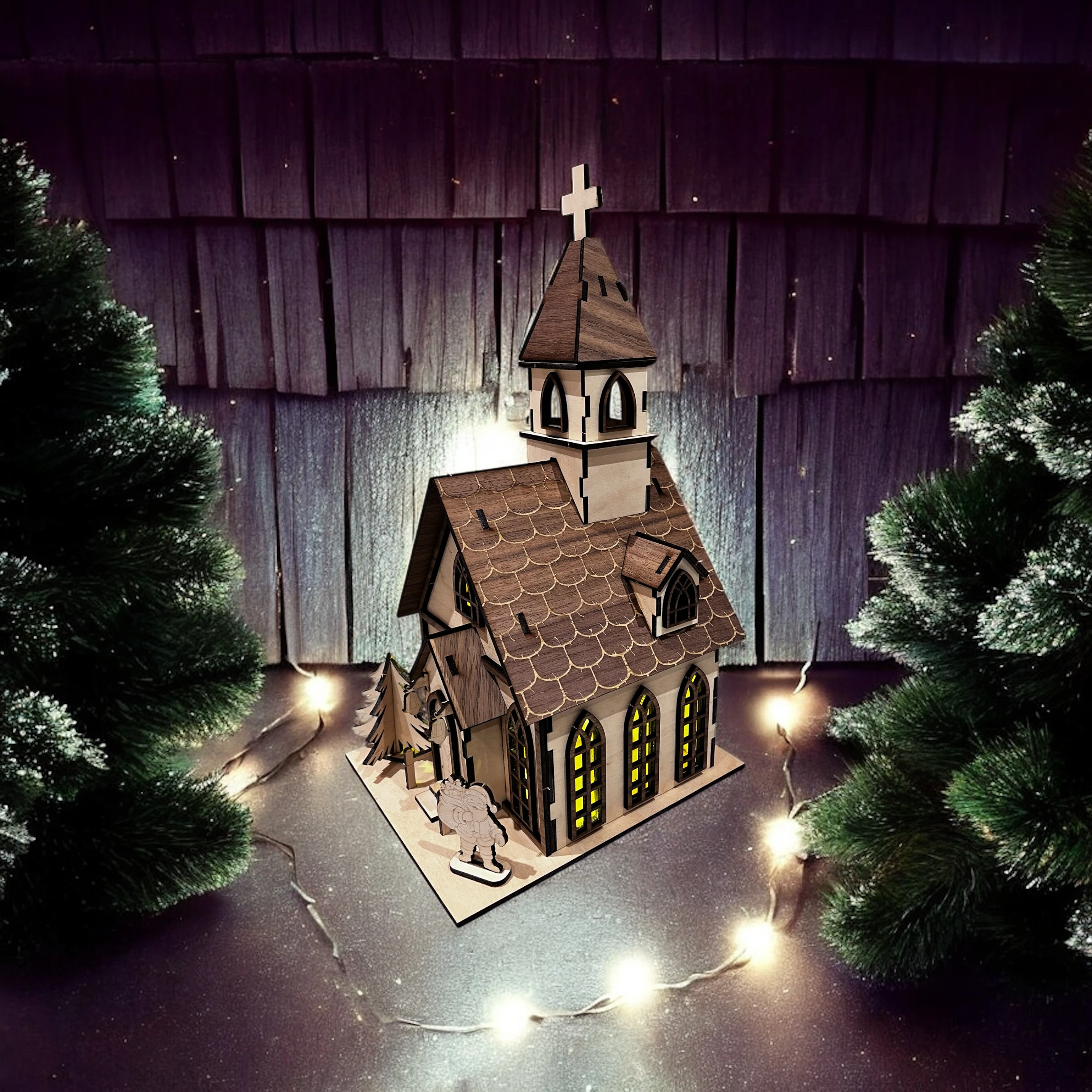 Église de Noël lumineuse en bois – Décoration artisanale avec LED intégrée