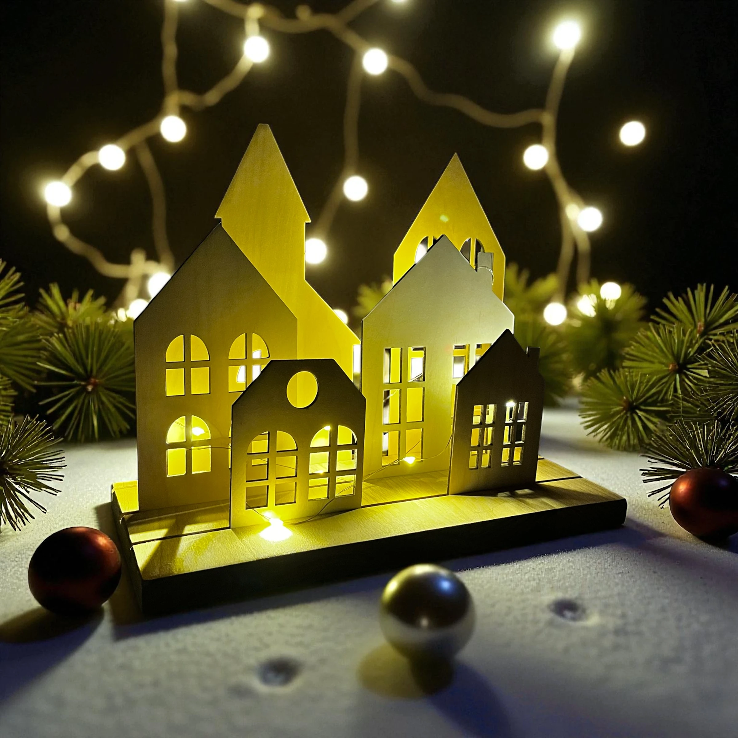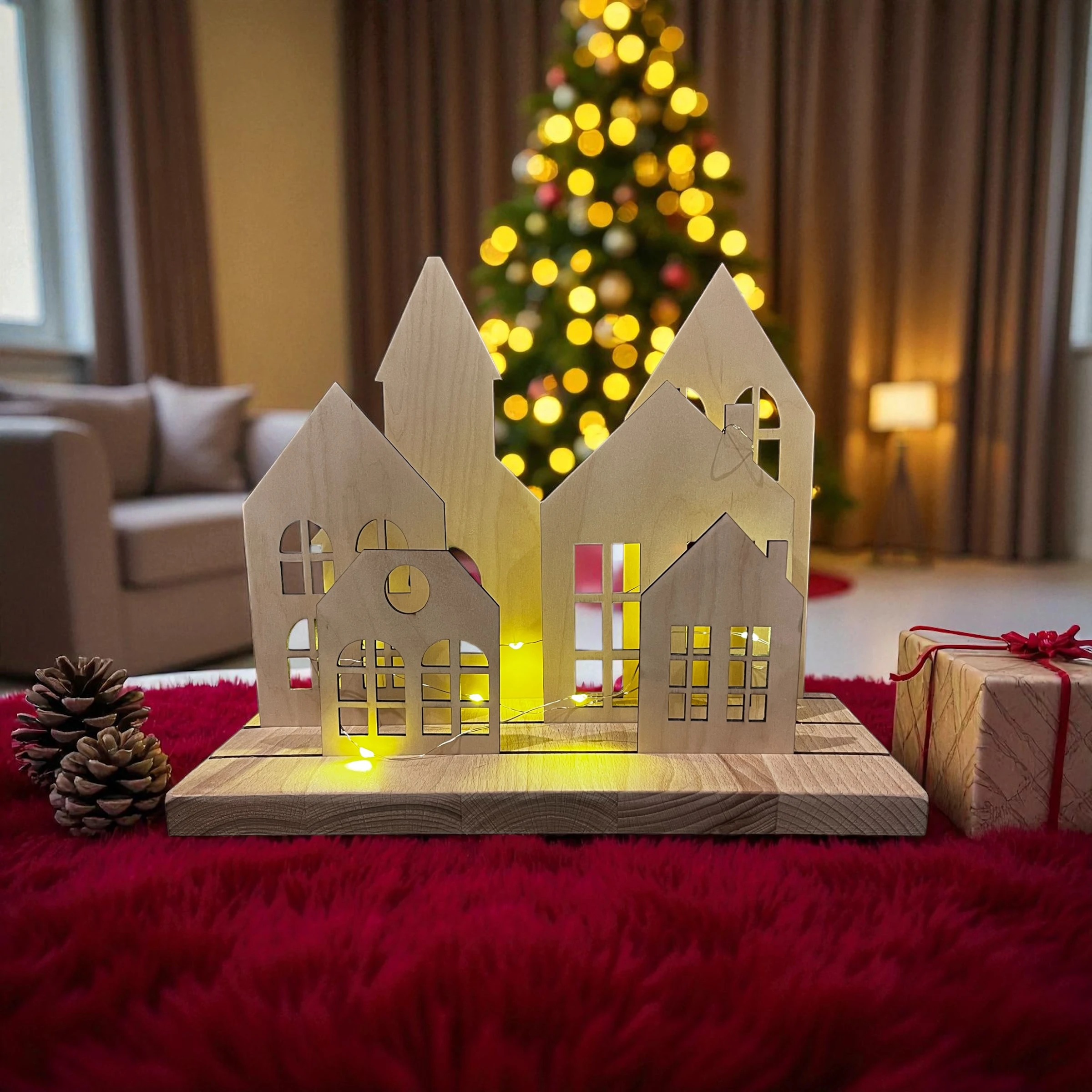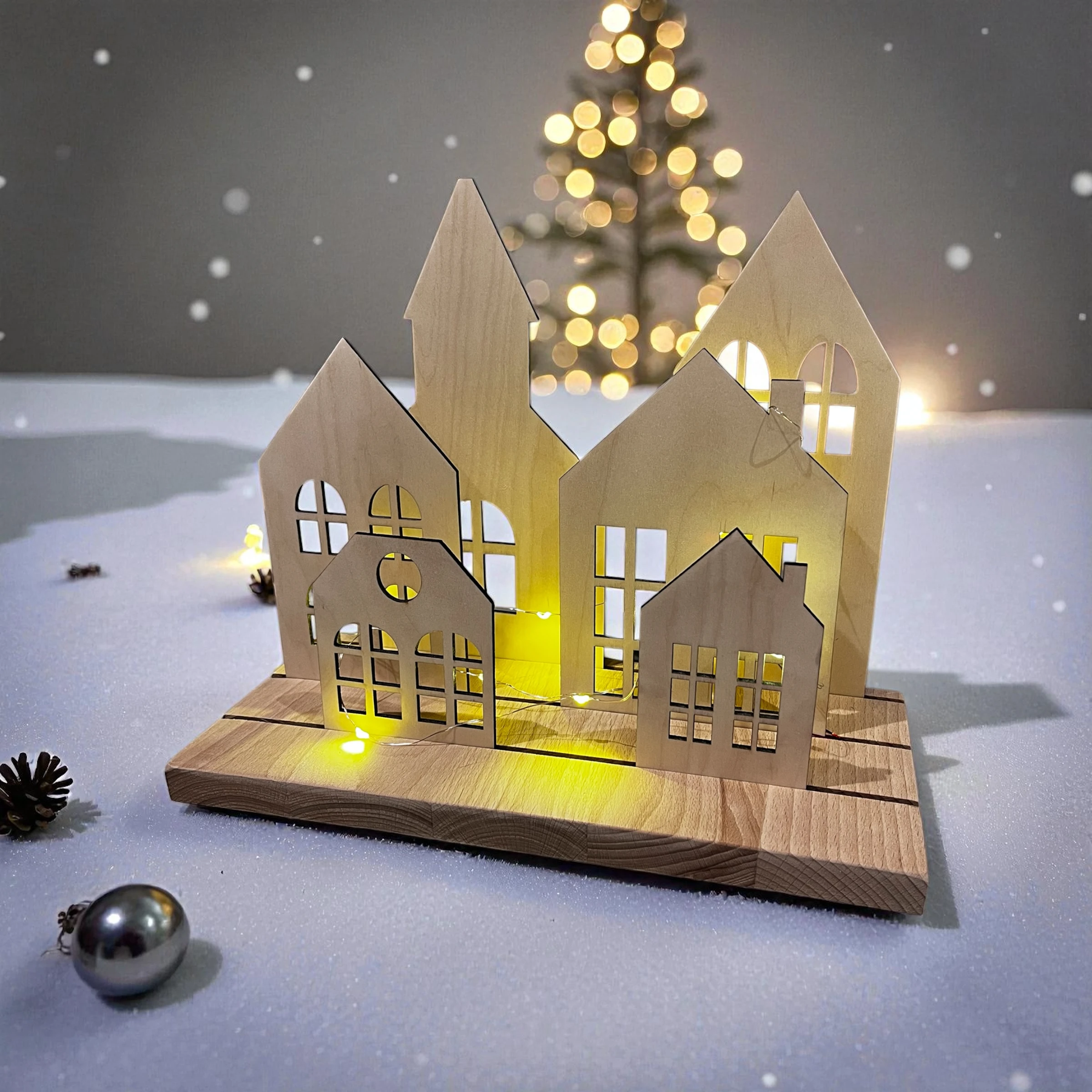 Village de Noël décoratif composé de silhouettes de maisons en bois de bouleau (3 mm), éclairées par une guirlande LED intégrée. Une création artisanale pleine de chaleur pour vos fêtes.